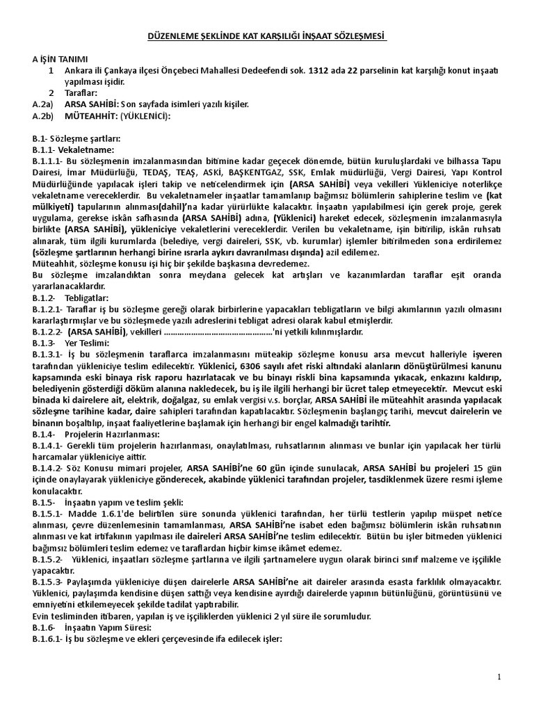 Kat karşılığı inşaat sözleşmesi örneği.